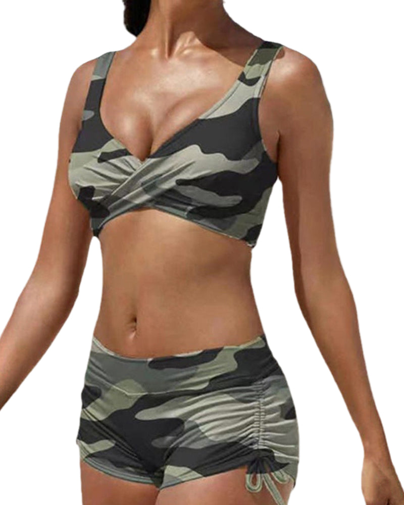 Women’s Two Piece Swimsuit with Cross Front Top and Ruched Shorts